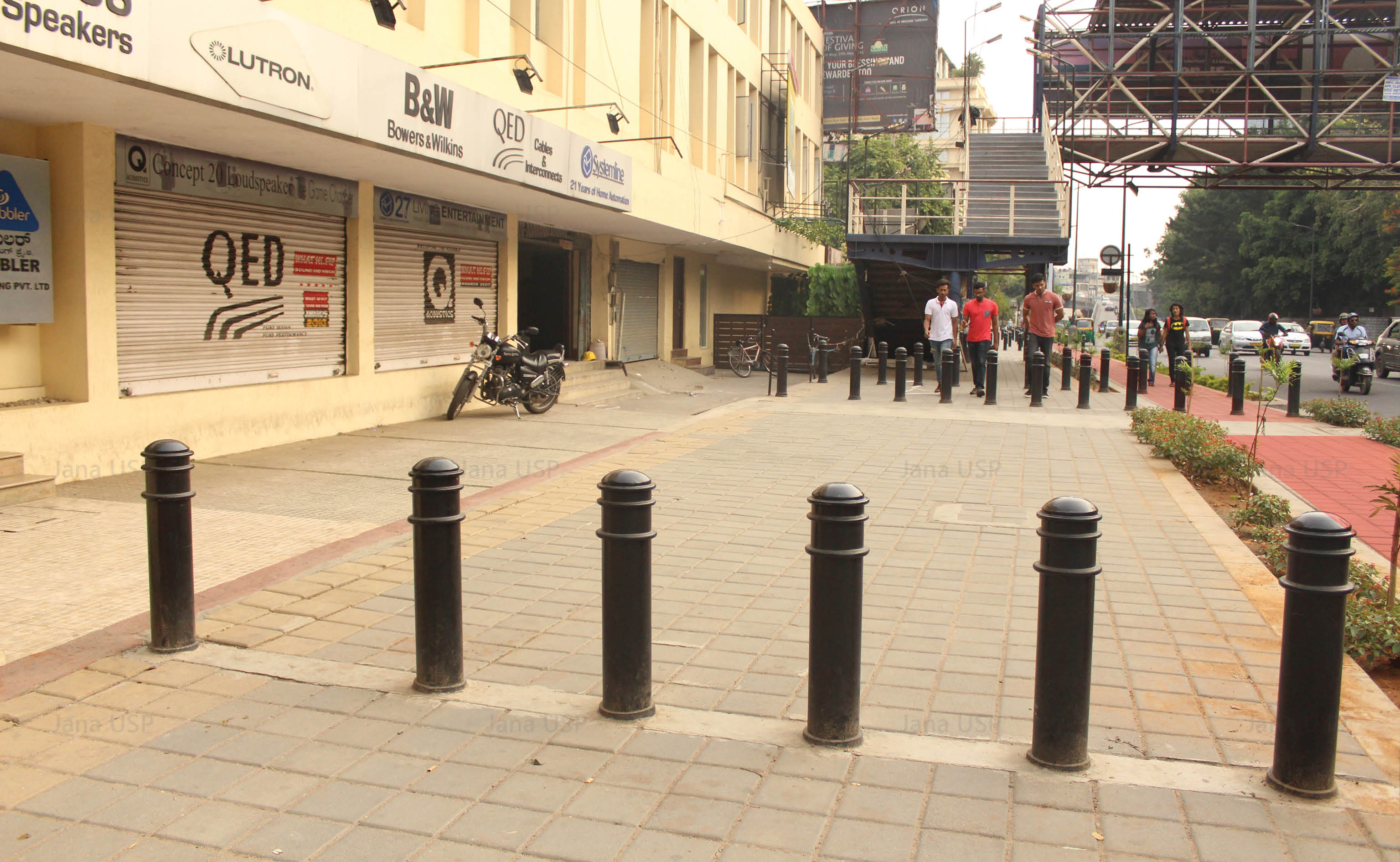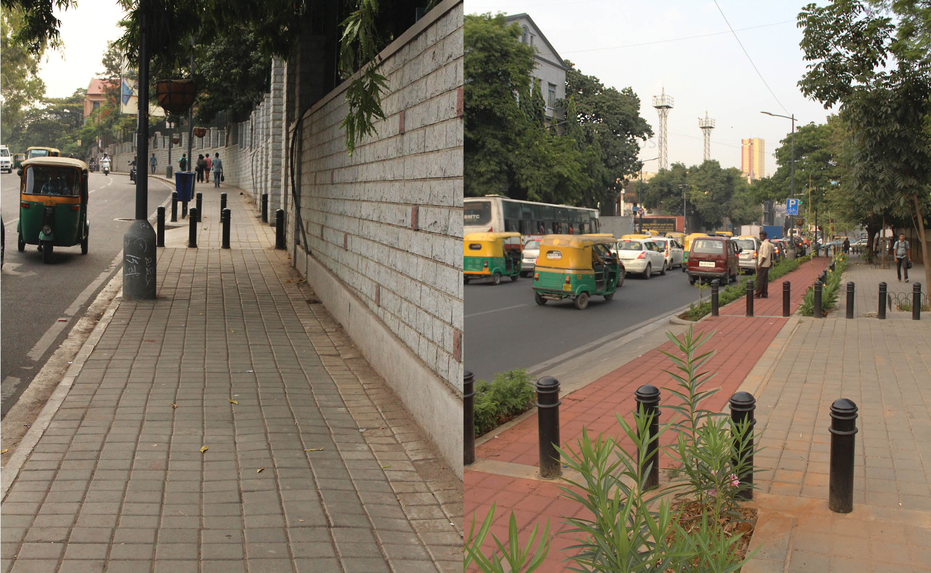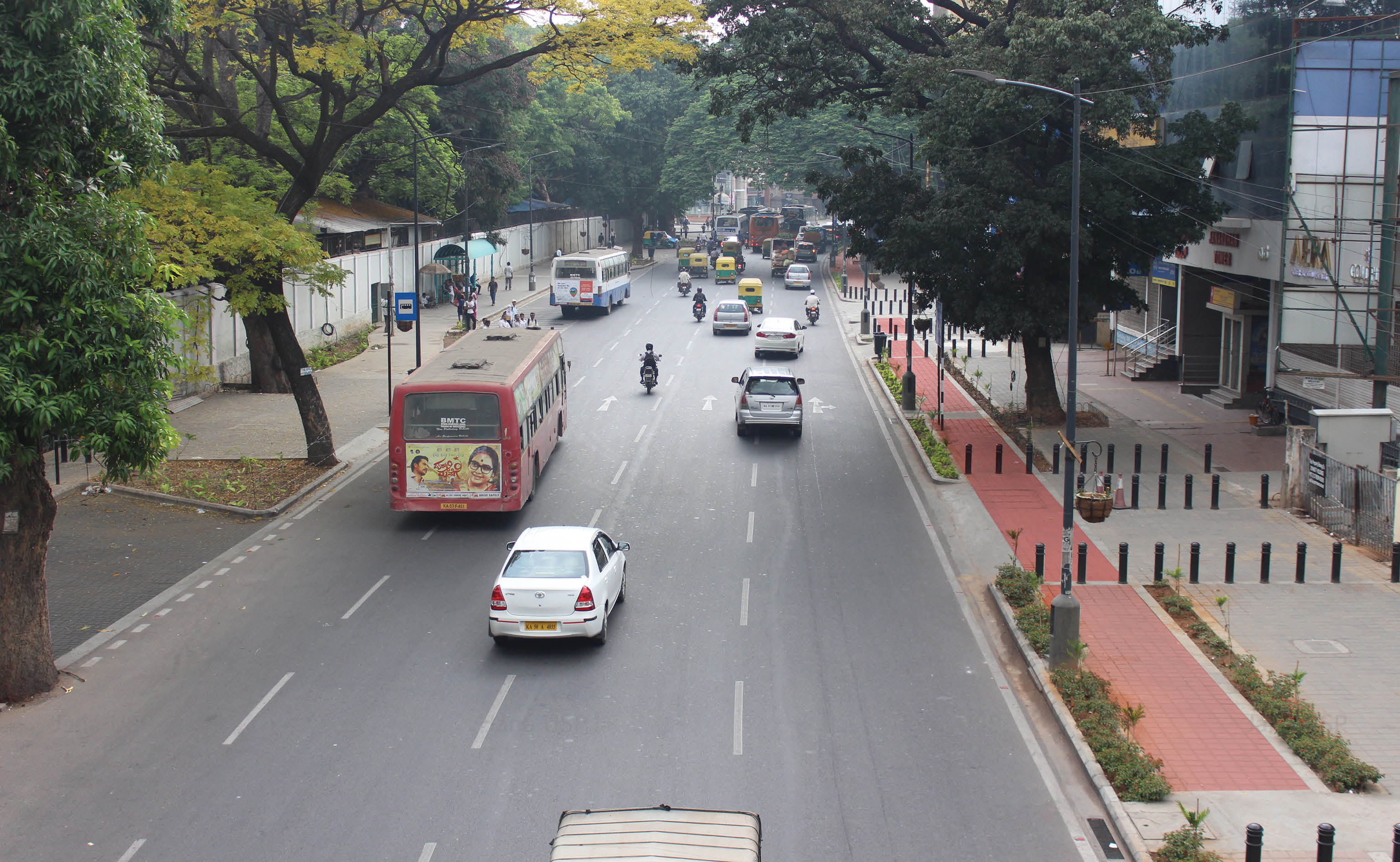 After Tender SURE, based on traffic volume and carrying capacity, the road has been divided into two sections. The first segment from Richmond Circle to Cariappa Circle supports 4 travel lanes of uniform width. Both sides of the road have evenly paved continuous footpaths separated from other forms of movement by landscape strips. There is a cycle track on one side of the road, and organized street parking on the other side along with a 65M long bus bay.