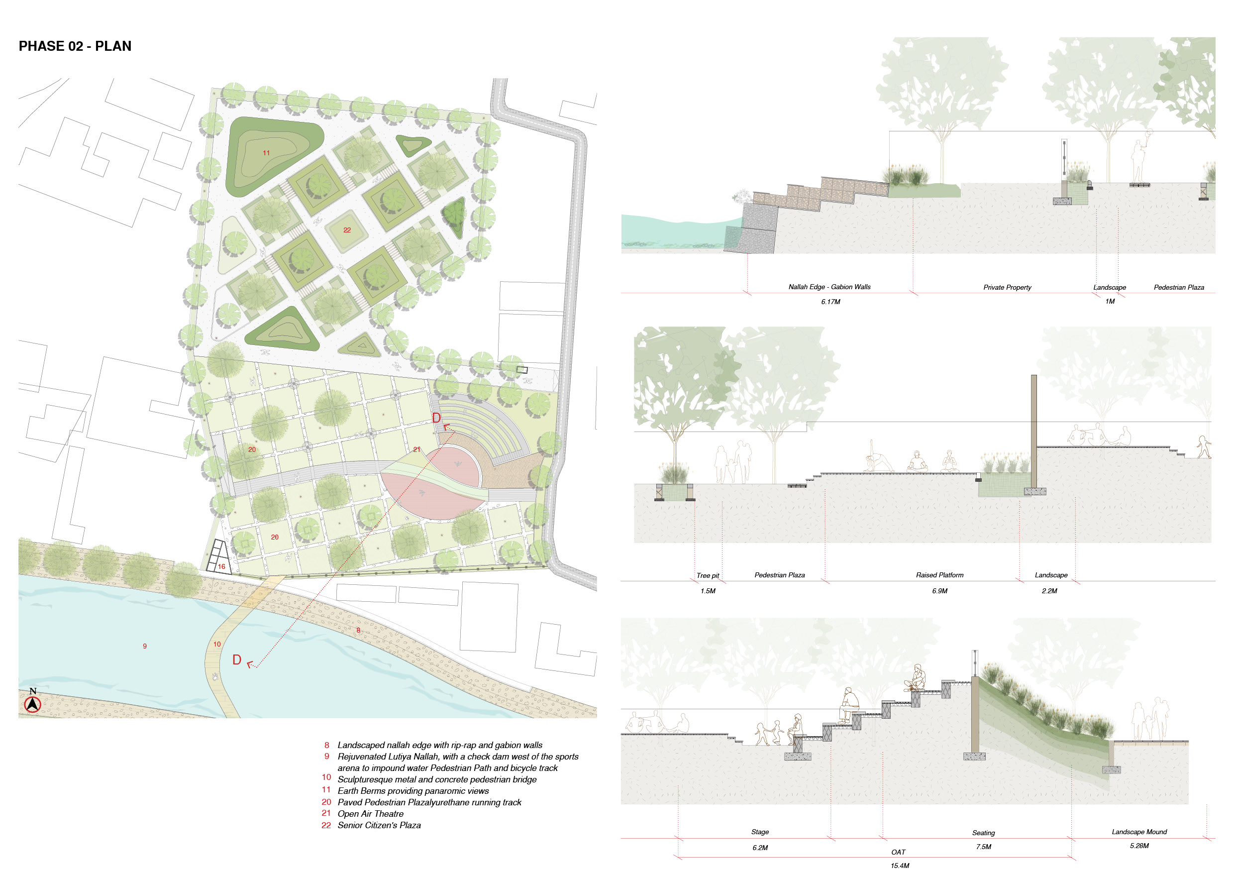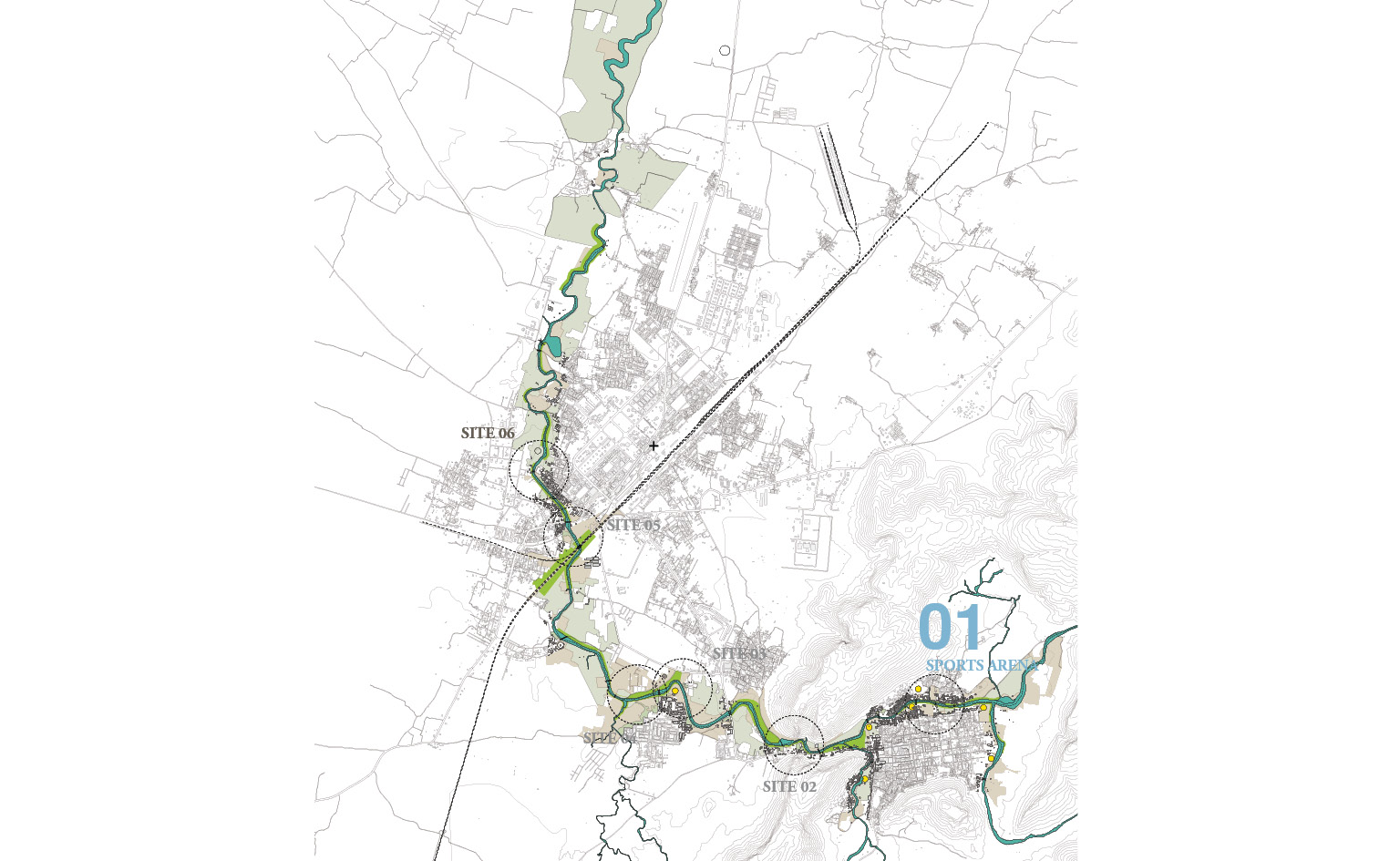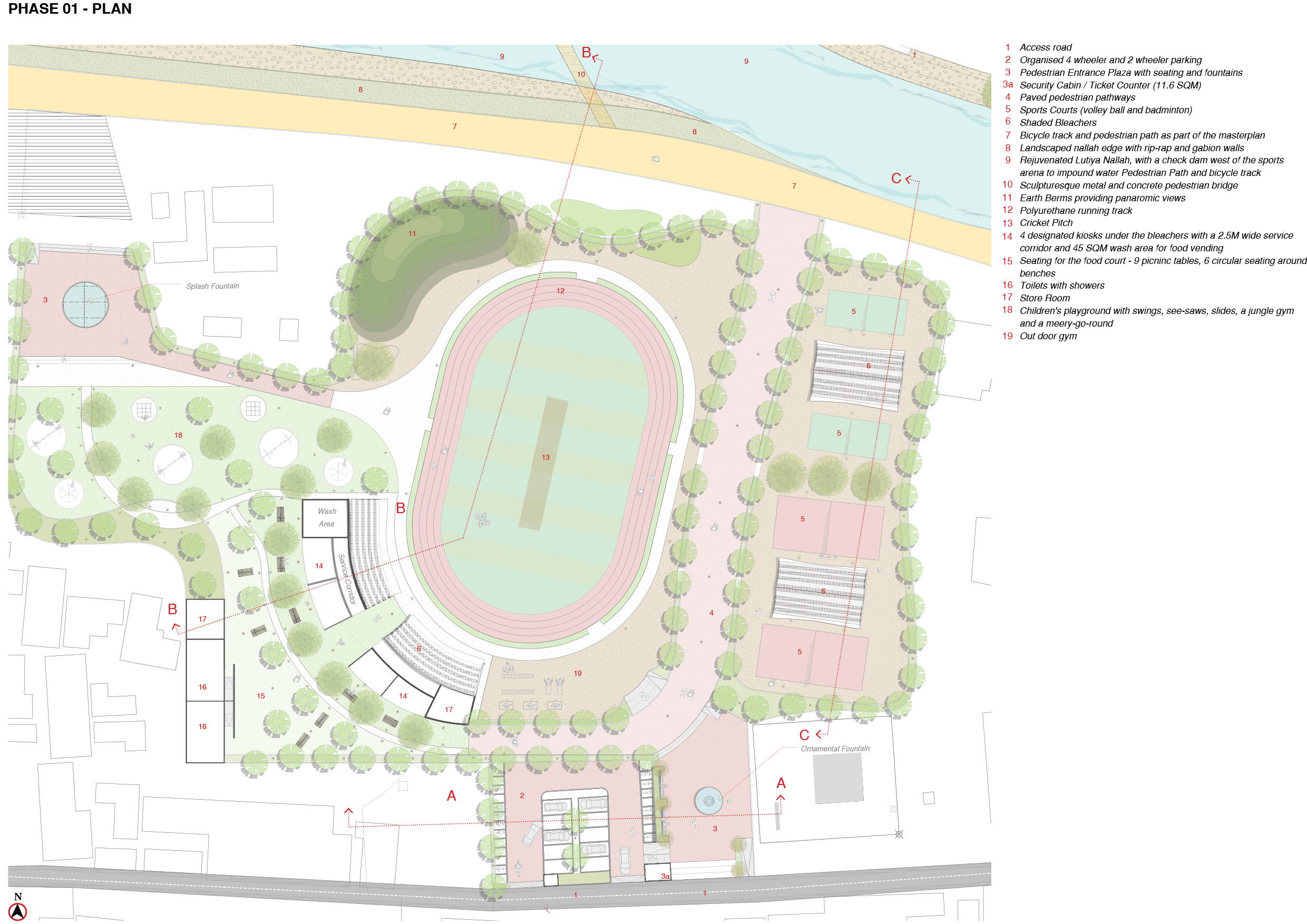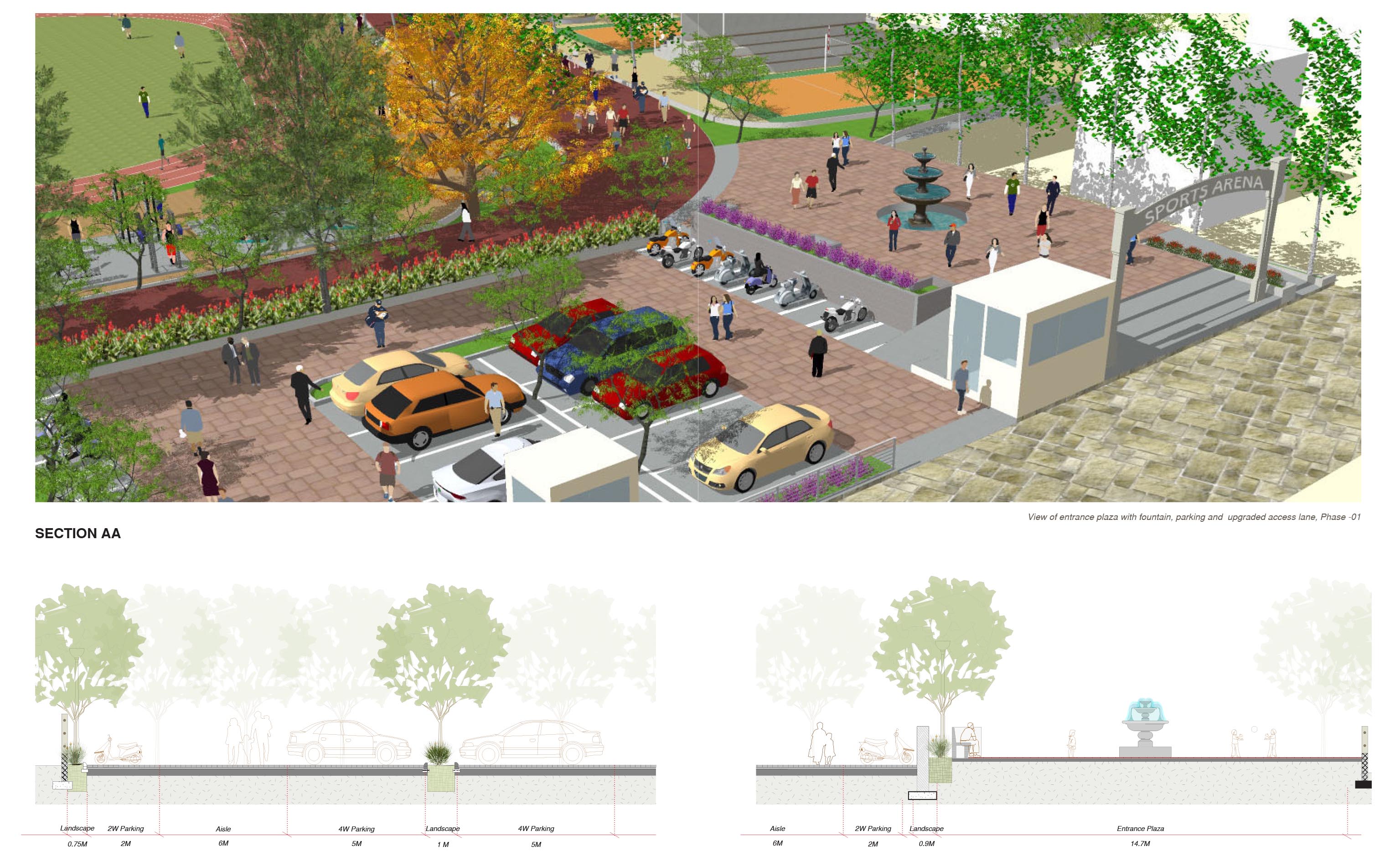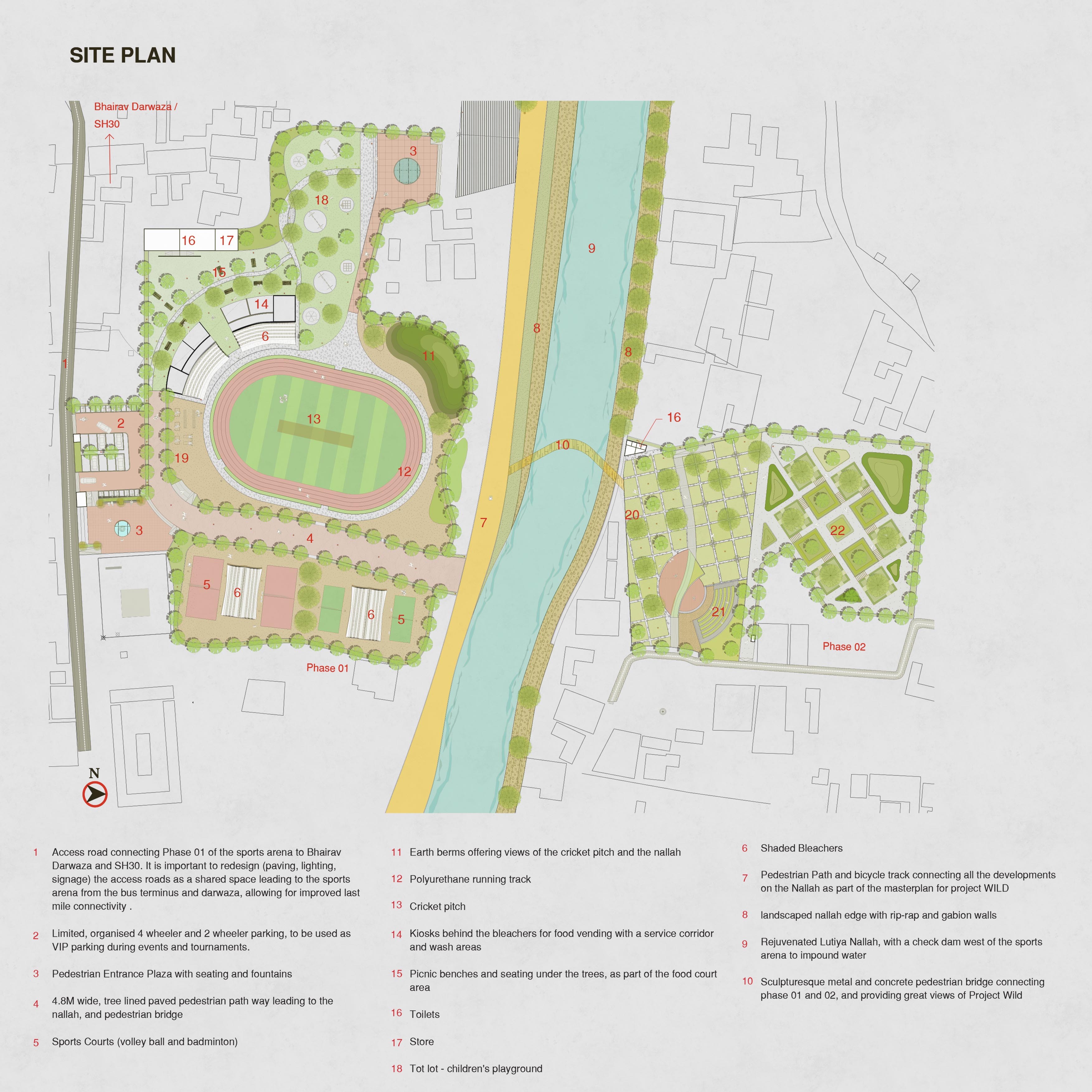 The old city of Sawai Madhopur is surrounded by mountains and bordered by the Lutiya Nallah on the west. Like most old cities in India it is dense, crowded and suffers from lack of open space. A sports arena was proposed in two phases on both banks of the nallah, at the old city, to create a much needed community space for all ages, with sports facilities, children’s play areas, a food court, and a senior citizens plaza.